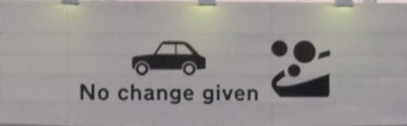 prostudovaná cesta je fajn, víme, že budeme platit mýtné, a i když jedeme v pátek po poledni, tak ani před mýtnou bránou se netvoří dlouhé fronty. I tak najíždím do úplně volného jízdního pruhu, kde jak zjišťuji v budce nesedí mýtný, ale ten je nahrazen hustou síťkou zaústěnou do "pokladny", a pokud tam vhodíme onu 1£, tak se nám otevře závora. Nejmenším naším platidlem je ale 5£ bankovka, a ta se tam neskutálí. Sice nad tímto jízdním pruhem byla tabulka s divnou ikonou